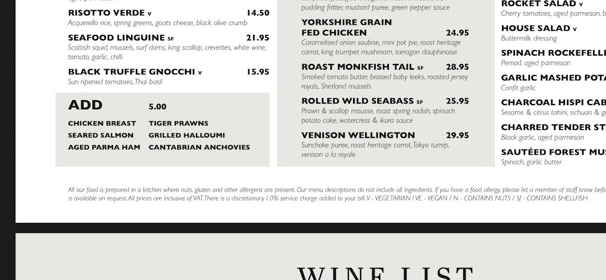 The menu at The Whitehall Restaurant & Bar is a showcase of both creativity and versatility, catering to a wide range of tastes and dietary preferences. Starters such as Scottish King Scallops, Loch Duart Salmon, French Onion Soup, and Duck Duck Goose set a sophisticated tone, while small plates like Potato Croquettes, XO Crispy Scottish Squid, and Crispy King Prawns provide lighter, shareable options. For raw seafood lovers, Lindisfarne, Cumbrae, Yellow Fin Tuna Tartare, and Dry Aged Beef Tataki offer freshness and precision. The salad section impresses with offerings like Super Food Salad, Grilled Chicken Caesar, and Torched Burrata Tuna Niçoise Salad. Grill and main dishes deliver heartier fare, including Tasting of Nidderdale Lamb, Duo of Chester White Pork, Saute Chicken ‘Marengo’, Wild Atlantic Halibut, and Scottish Sea Trout. Pasta enthusiasts can choose from Linguine Pistou, Pappardelle Pomodoro, Risotto Milanese, Seafood Linguine, and Black Truffle Gnocchi, while pizza options like Parma Ham, Pepperoni, Sea Tiger Prawn, and Goats Cheese add a casual indulgence. Sides are equally tempting, from Triple Cooked Chips and Truffle & Parmesan Fries to Spinach Rockefeller and fresh House Salad. Desserts are a perfect finish, featuring Banoffee Profiteroles, Sticky Toffee Pudding, Summer Berry Cheesecake, and Salted Caramel & Dark Chocolate Tart. The menu thoughtfully extends to gluten-free and vegan diners, with options such as Black Truffle Pasta, Seafood Risotto, Vegan Cheese & Tomato Pizza, and Chilled Tropical Rice Pudding. Even the kids’ menu is thoughtfully curated, offering Margherita Pizza, Roast Chicken & Mushroom Pizza, Crispy Chicken Goujons, and Mini Fish & Chips, alongside treats like Chocolate Brownie and Ice Cream Selection. Overall, the menu strikes a balance between refined flavors, approachable comfort, and inclusivity, making it an impressive culinary offering at the heart of Leeds.